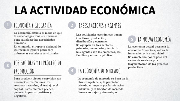 Las actividades económicas tienen tres fases: producción, distribución y consumo.Se agrupan en tres sectores: primario, secundario y terciario. Sus agentes son las empresas, las familias y el sector público.