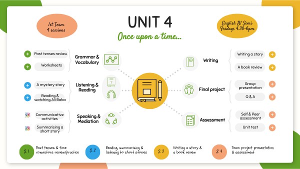 Leemos en grupos fragmentos de una misma historia y completamos con los tiempos adecuados. Ponemos en común y ordenamos la narración después (4/TG-15'- tarjetas) Primera reunión para hablar del proyecto final de la unidad. Lluvia de ideas para crear nuestra historia: personajes, época, trama... (4-papel/jamboard-15')
