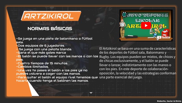 -Se juega en una pista de balonmano o fútbol sala. -Dos equipos de 6 jugadores. - Se juega con una pelota blanda. -Gana el que más goles marca -El balón se puede llevar con las manos o con los pies. -Cuatro tiempos de 15 minutos. -Cambios ilimitados. -Una vez te pases el balón a los pies ya no puedes volvera a coger con las manos. -Para quitar el balón al equipo rival tenemos que tocarle cuando tenga el balónen las manos.