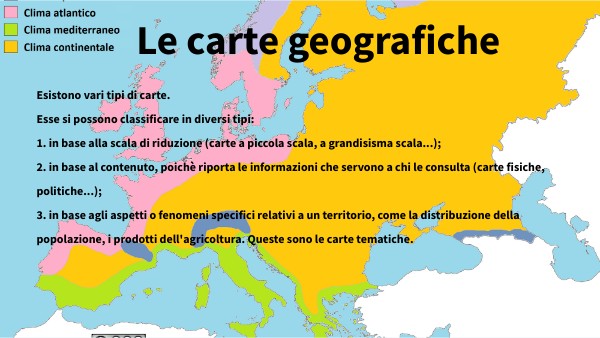 Esistono vari tipi di carte.Esse si possono classificare in diversi tipi: 1. in base alla scala di riduzione (carte a piccola scala, a grandisisma scala...); 2. in base al contenuto, poichè riporta le informazioni che servono a chi le consulta (carte fisiche, politiche...); 3. in base agli aspetti o fenomeni specifici relativi a un territorio, come la distribuzione della popolazione, i prodotti dell'agricoltura. Queste sono le carte tematiche.