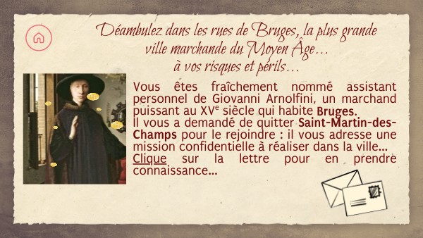 Vous êtes fraîchement nommé assistant personnel de Giovanni Arnolfini, un marchand puissant au XVe siècle qui habite Bruges. Il vous a demandé de quitter Saint-Martin-des-Champs pour le rejoindre : il vous adresse une mission confidentielle à réaliser dans la ville... Clique sur la lettre pour en prendre connaissance...