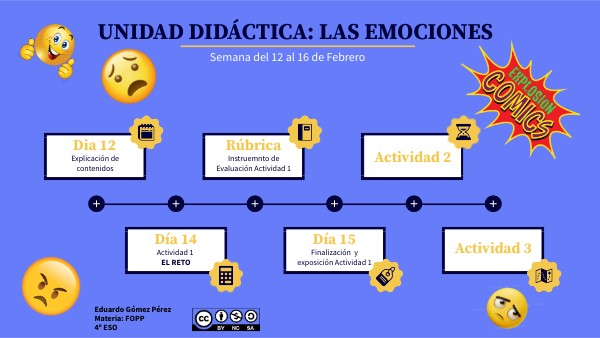 1.- Instrucciones:Realizaremos un cómic en el que en diferentes viñetas mostraremos una situación que represente una emoción (o varias), y que a través de las distintas viñetas podamos identificar que emoción nos intenta trasmitir.Dicha confección se realizará durante la sesión del día 14, y se terminará durante los primeros 20 minutos del día 15.