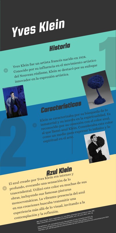 BBC News Mundo. (2014, septiembre 11). Yves Klein: el hombre que inventó un color. BBC. https://www.bbc.com/mundo/noticias/2014/09/140905_vert_cul_yves_klein_azul_ng antrophistoria. (s/f). Antrophistoria.com. Recuperado el 23 de noviembre de 2023, de https://www.antrophistoria.com/2017/05/yves-klein-el-artista-que-patento-un.html Yves Klein. (s/f). HA! Recuperado el 23 de noviembre de 2023, de https://historia-arte.com/artistas/yves-klein