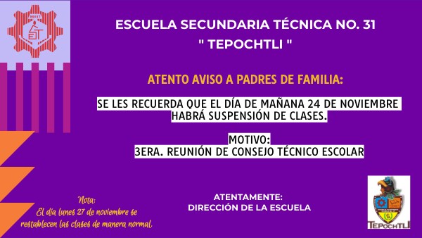 SE LES RECUERDA QUE EL DÍA DE MAÑANA 24 DE NOVIEMBRE HABRÁ SUSPENSIÓN DE CLASES. MOTIVO: 3ERA. REUNIÓN DE CONSEJO TÉCNICO ESCOLAR