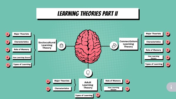 Brieger, E., Arghode, V., & McLean, G. (2020). Connecting theory and practice: reviewing six learning theories to inform online instruction. European Journal of Training and Development 44(4/5). 321-339. https://www-emerald- com.lopes.idm.oclc.org/insight/content/doi/10.1108/EJTD-07-2019-0116/full/html Cherry, K. (2022). What is sociocultural theory? Very Well Mind. https://www.verywellmind.com/what-is-sociocultural-theory-2795088 Morano, S. (2019). Retrieval practice for retention and transfer. Teaching Exceptional Children, 51(6), 436–444. https://doi-org.lopes.idm.oclc.org/10.1177/0040059919847210 Ornstein, A. C., & Hunkins, F. P. (2016). Curriculum: foundations, principles, and issues. (7th ed). Pearson. Siemens, G. (2005). Connectivism: A learning theory for the digital age. International Journal for Instructional Technology & Distance Learning. (2)1. http://www.itdl.org/Journal/Jan_05/article01.htm Tweedell, C. (2000). A theory of adult learning and implications for practice. ERIC. https://eric.ed.gov/?id=ED446702 Western Governors University. (2020). 10 simple principles of adult learning. WGU Blog. https://www.wgu.edu/blog/adult-learning-theories-principles2004.html Western Governors University. (2021). Connectivism learning theory. WGU Blog. https://www.wgu.edu/blog/connectivism-learning-theory2105.html#close
