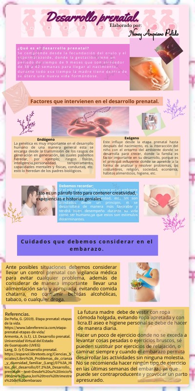 De Peña, G. (2019). Etapa prenatal: etapas de la vida. https://www.labreferencia.com/etapa-prenatal-etapas-de-vida/ Armenta, A. (s.f.). L3. Desarrollo prenatal. Universidad Virtual del Estado de Guanajuato (UVEG) Lang, D. (s f) Desarrollo prenatal. https://espanol.libretexts.org/Ciencias_Sociales/Libro%3A_Problemas_de_crianza_y_diversidad_familiar_(Lang)/07%3A_Hitos_del_desarrollo/07.2%3A_Desarrollo_prenatal#:~:text=Desde%20su%20inicio%20como%20una,los%20tres%20trimestres%20del%20embarazo