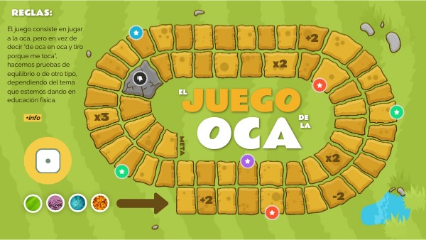 El juego consiste en jugar a la oca, pero en vez de decir “de oca en oca y tiro porque me toca”, hacemos pruebas de equilibrio o de otro tipo, dependiendo del tema que estemos dando en educación física.