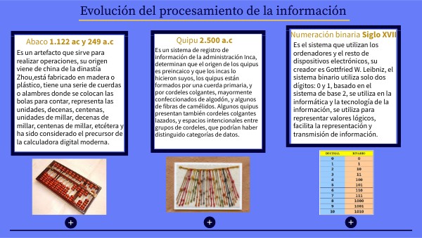 • INA Virtual.(2023). Generaciones de las computadoras. Recuperado de: https://www.inavirtual.ed.cr/pluginfile.php/35937/mod_resource/content/1/Generaciones%20de%20las%20computadoras.pdf • Martínez Morales M.(2023). Ábacos. Recuperado de: https://www.uv.mx/cienciauv/blog/abacos/#:~:text=Un%20%C3%A1baco%20es%20un%20artefacto,para%20ense%C3%B1ar%20estos%20c%C3%A1lculos%20simples. • Museo de informática.(2013). Las Primeras Computadoras. Recuperado de: https://museodeinformatica.blogspot.com/p/blog-page_4339.html • Museo Larco.(2018). Quipus Inca. Recuperado de: https://www.museolarco.org/exposicion/exposicion-permanente/exposicion-en-linea/tejidos-del-antiguo-peru/quipus-inca/#:~:text=Los%20quipus%20fueron%20el%20principal,la%20poblaci%C3%B3n%20que%20se%20registraba. • Peralta Pérez J.A.(2023). La computadora EDVAC. Recuperado de: https://www.tecnologia-informatica.com/la-computadora-edvac/ • Pibank.(2020). Origen del ábaco, la primera calculadora de la historia. Recuperado de: https://www.pibank.es/origen-abaco/#:~:text=Esta%20tablilla%20para%20hacer%20c%C3%A1lculos,1.122%20a.C.%20y%20249%20a.C. • Quipu.(2023). Qué es un quipu. Recuperado de: https://getquipu.com/es/que-es-un-quipu#:~:text=El%20Quipu%20m%C3%A1s%20antiguo%20data,pelo%20de%20llama%20o%20alpaca. • Revista transformación digital.(2023). La Pascalina, la primera calculadora mecánica, inventada por Blaise Pascal en 1645. Recuperado de: https://www.revistatransformaciondigital.com/2021/10/28/la-pascalina-la-primera-calculadora-mecanica-inventada-por-blaise-pascal-en-1645/ • Sancho Ehlert D.(2023). Reglas de cálculo. Uma Divulga. Recuperado de: https://www.umadivulga.uma.es/museo-virtual/informatica/reglas-de-calculo/#:~:text=Las%20reglas%20de%20c%C3%A1lculo%20son,trigonom%C3%A9tricas%20o%20las%20ra%C3%ADces%20cuadradas. • Sancho Ehlert D.(2023). Tarjetas Perforadas. Uma Divulga. Recuperado de: https://www.umadivulga.uma.es/museo-virtual/informatica/tarjetas-perforadas/ • Sancler.V.(2018). Sexta generación de computadoras. Recuperado de: https://www.euston96.com/sexta-generacion-computadoras/ • Sancler. V.(2018). Tarjeta perforada. Recuperado de: https://www.euston96.com/tarjeta-perforada/