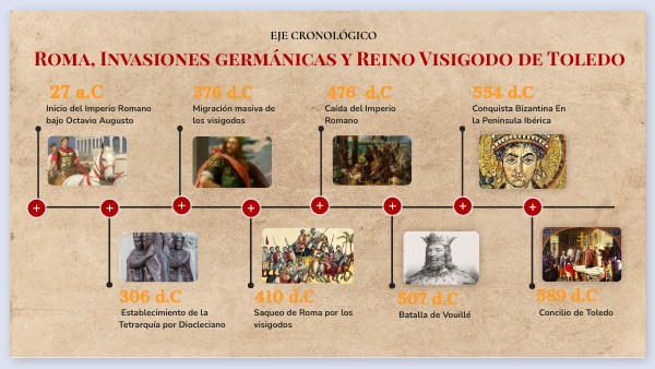 - Crisis política: lucha por el poder. Los problemas aumentan cuando diferentes emperadores se suceden en un corto período de tiempo. - El problema del ejército y la frontera: Al no poder mantener una superficie tan grande, en el año 395 Teodosio dividió el imperio en Roma Oriental y Occidental. En el Occidente romano, las ciudades locales intentaron cruzar fronteras. Este hecho, junto con los problemas políticos, hizo que los generales fueran más poderosos y los emperadores tendían a unirse al ejército y no al revés. - Problemas económicos: los problemas políticos y regionales disminuyen el comercio, disminuyen los ingresos y aumentan los precios. - Invasiones Bárbaras: Tribus bárbaras (extranjeras) de fuera del Imperio comienzan a atacar e intentar infiltrarse. Entre ellos destacan los alemanes (ostrogodos, visigodos, francos, borgoñones, alamanes, anglosajones...). - El campo: los problemas y ataques políticos y económicos amenazan a las ciudades, y mucha gente decide trasladarse al campo. Porque el campo es un lugar mejor y más seguro para formar una familia.