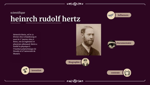 HEINRICH HERTZ est née le 22 février 1857 à hambourg et mort le 1er janvie 1894 à bonn et un ingénieur et physicien allemand. il etudia a l'école privée Richard l'ange de 1862 à 1872. En mars 1875 etant bachelier il se rend a francfort pour un apprentissage d'un ans au service des traveaux publics. En 1883 il à efectuer des reherches pour vérifier les éxperience de James Clerk Maxwell sur les ondes électromagnétiques.En 1887 il comfirme les hypotèses de Maxwell sur l'éxistance d'ondes électromagnétiques qu'il a produit à l'aide d'un oscillateur et d'une antenne. Et c'est en son honneur qu'ils ont donné son nom Hertz a l'international pour la fréquence.