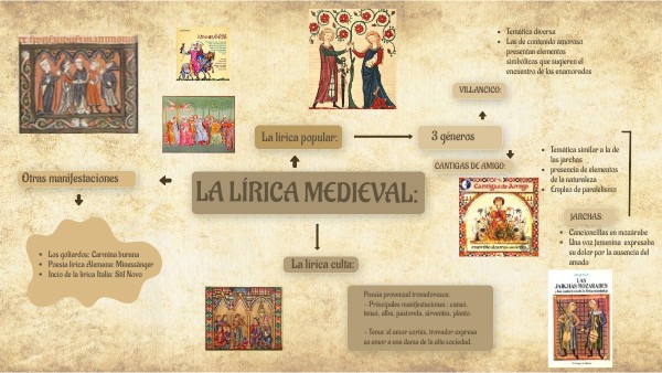 Poesía provenzal trovadoresca: - Principales manifestaciones : cansó, tensó, alba, pastorela, sirventés, planto. - Tema: el amor cortés, trovador expresa su amor a una dama de la alta sociedad.