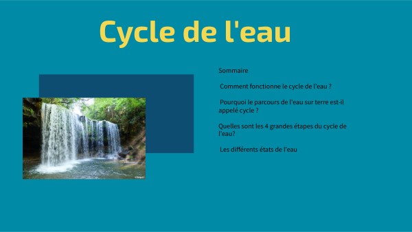 Sommaire Comment fonctionne le cycle de l'eau ? Pourquoi le parcours de l'eau sur terre est-il appelé cycle ? Quelles sont les 4 grandes étapes du cycle de l'eau? Les différents états de l'eau