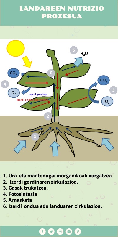 1. Ura eta mantenugai inorganikoak xurgatzea 2. Izerdi gordinaren zirkulazioa. 3. Gasak trukatzea. 4. Fotosintesia 5. Arnasketa 6. Izerdi ondua edo landuaren zirkulazioa.