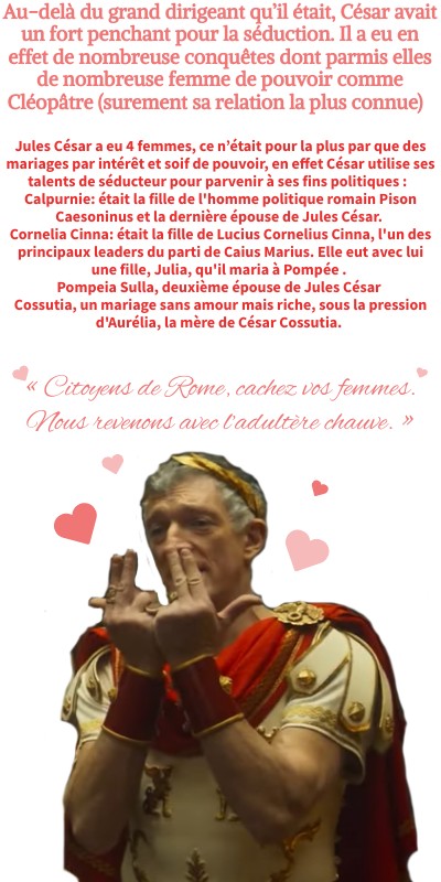 Au-delà du grand dirigeant qu’il était, César avait un fort penchant pour la séduction. Il a eu en effet de nombreuse conquêtes dont parmis elles de nombreuse femme de pouvoir comme Cléopâtre (surement sa relation la plus connue)