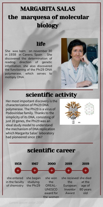 Her most important discovery is the characterization of Phi29 DNA polymerase. The Phi29 is a virus of Podoviridae family. Thanks to the simplicity of its DNA, consisting of just 20 genes, the Phi29 was an ideal study model to understand the mechanism of DNA replication which Margarita Salas' laboratory had pioneered since 1967