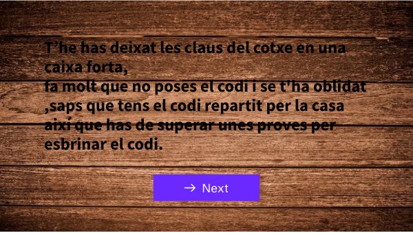 T’he has deixat les claus del cotxe en una caixa forta, fa molt que no poses el codi i se t'ha oblidat ,saps que tens el codi repartit per la casa així que has de superar unes proves per esbrinar el codi.