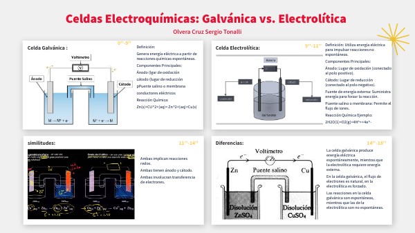 Definición: Genera energía eléctrica a partir de reacciones químicas espontáneas. Componentes Principales: Ánodo (lgar de oxidación cátodo (lugar de reducción pPuente salino o membrana conductores eléctricos Reacción Química: Zn(s)+CU^2+(aq)< Zn^2+(aq)+Cu(s)