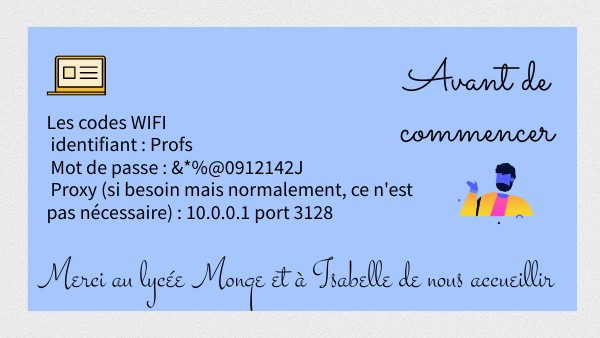 Les codes WIFI identifiant : Profs Mot de passe : &*%@0912142J Proxy (si besoin mais normalement, ce n'est pas nécessaire) : 10.0.0.1 port 3128