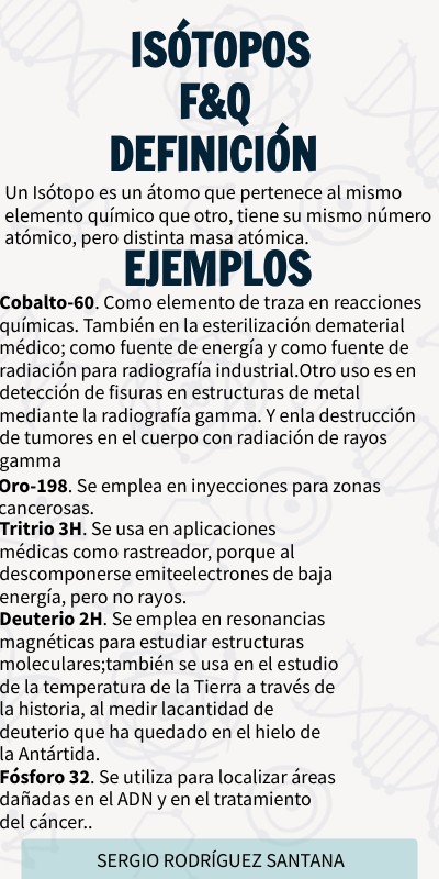 Tritrio 3H. Se usa en aplicaciones médicas como rastreador, porque al descomponerse emiteelectrones de baja energía, pero no rayos. Deuterio 2H. Se emplea en resonancias magnéticas para estudiar estructuras moleculares;también se usa en el estudio de la temperatura de la Tierra a través de la historia, al medir lacantidad de deuterio que ha quedado en el hielo de la Antártida. Fósforo 32. Se utiliza para localizar áreas dañadas en el ADN y en el tratamiento del cáncer..