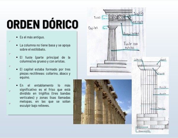En el entablamento lo más significativo es el friso que está dividido en triglifos (tres bandas verticales) y zonas lisas llamadas metopas, en las que se solían esculpir bajo relieves.