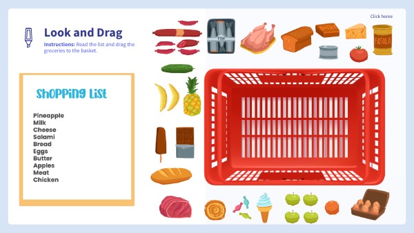Instructions: Read the list and drag the groceries to the basket.