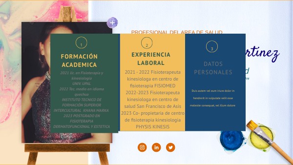2021 lic. en Fisioterapia y kinesiologiaUNIV. UPAL2022 Tec. medio en idioma quechua INSTITUTO TECNICO DE FORMACIÓN SUPERIOR INTERCULTURAL KHANA MARKA 2023 POSTGRADO EN FISIOTERAPIA DERMATOFUNCIONAL Y ESTETICA