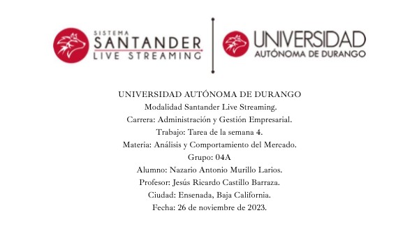 UNIVERSIDAD AUTÓNOMA DE DURANGO Modalidad Santander Live Streaming. Carrera: Administración y Gestión Empresarial. Trabajo: Tarea de la semana 4. Materia: Análisis y Comportamiento del Mercado. Grupo: 04A Alumno: Nazario Antonio Murillo Larios. Profesor: Jesús Ricardo Castillo Barraza. Ciudad: Ensenada, Baja California. Fecha: 26 de noviembre de 2023.