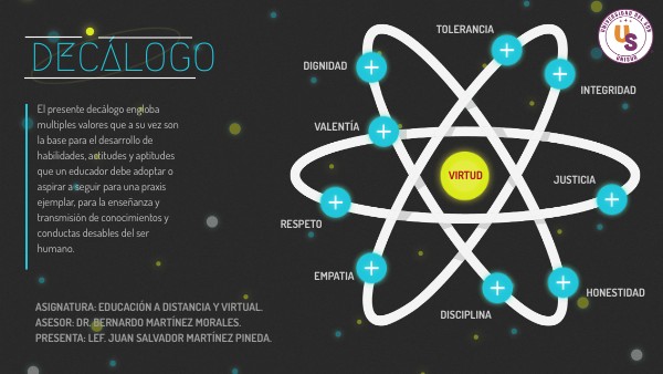 El presente decálogo engloba multiples valores que a su vez son la base para el desarrollo de habilidades, actitudes y aptitudes que un educador debe adoptar o aspirar a seguir para una praxis ejemplar, para la enseñanza y transmisión de conocimientos y conductas desables del ser humano.