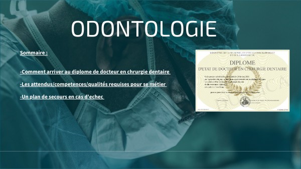 Sommaire : -Comment arriver au diplome de docteur en chrurgie dentaire -Les attendus/competences/qualités requises pour se métier -Un plan de secours en cas d'echec