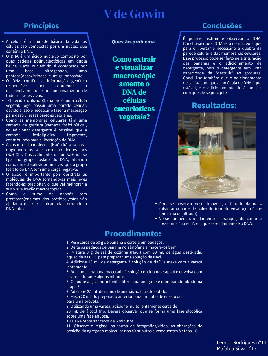 É possível extrair e observar o DNA. Conclui-se que o DNA está no núcleo e que para o libertar é necessário a quebra da parede celular e das membranas celulares. Esse processo pode ser feito pela trituração das bananas e o adicionamento de detergente, pois o detergente tem uma capacidade de “destruir” as gorduras. Conclui-se também que o adicionamento de sal faz com que a molécula de DNA fique estável, e o adicionamento do álcool faz com que ele se precipite.