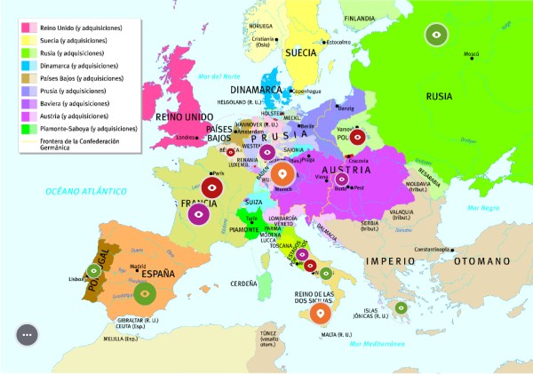 Guerra de los Ducados → 1864. Austria y Prusia se enfrentaron a Dinamarca por los ducados de Schelswig y Holstein, los cuales fueron incorporados a la Confederación Germánica. Guerra austro-prusiana → los austríacos fueron derrotados en la batalla de Sadowa en 1866. Se creó la Confederación Alemana del Norte, compuesta por los Estados alemanes protestantes. Guerra franco-prusiana → Prusia derrotó a Francia en la batalla de Sedán en 1866. Se incorporaron a Alemania los Estados alemanes del sur los cuales fueron arrebatados a Francia Alsacia y Lorena. Debido a estos territorios Francia y Alemania fueron rivales durante las siguientes décadas.