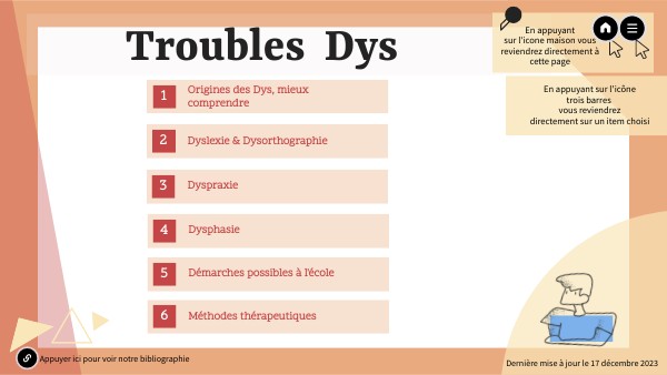 36.9. (2019, 19 septembre). Dyspraxie : je suis maladroit, et alors ? - 36.9° [Vidéo]. YouTube. https://www.youtube.com/watch?v=_ru1zX_-LhkBarrouillet, P. (2007). Dyslexie, dysorthographie, dyscalculie : bilan des données scientifiques. https://hal-lara.archives-ouvertes.fr/hal-01570674C’est pas sorcier. (2015, 7 septembre). Les troubles DYS - c’est pas sorcier [Vidéo].YouTube. https://www.youtube.com/watch?v=7jaeNhjz2rQDyspraxie. (2023, 15 septembre). Fédération Française des DYS. https://www.ffdys.com/troubles-dys/dyspraxieDyspraxie de l’enfant | Ameli.fr | assuré. (2023). https://www.ameli.fr/gard/assure/sante/themes/dyspraxie-enfant Habib, M. (2018). La constellation des dys : Bases neurologiques de l’apprentissage et de ses troubles. De Boeck Supérieur. Inserm. (2014, 10 octobre). Dyslexie, dysorthographie, dyscalculie [Vidéo]. YouTube. https://www.youtube.com/watch?v=fFQ1vmkebNA Jumel, B. (2015). Troubles des apprentissages : Approche intégrative. Jumel, B. (2016). Dyslexie : à qui la faute ? Dunod. Lhérété, H. (2018). Les troubles de l’enfant. https://doi.org/10.3917/sh.marmi.2018.01 Moret, A. (2018). Les troubles dys. https://doi.org/10.3917/dunod.moret.2018.01 Pouhet, A. (2016). Connaître les dys- et en mesurer les enjeux. Enfances & Psy, N° 71(3), 88 104. https://doi.org/10.3917/ep.071.0088 Pourquoi les enfants dyspraxiques ont-ils aussi des difficultés en maths ? · Inserm, La science pour la santé. (2020, 1 septembre). Inserm. https://www.inserm.fr/actualite/pourquoi-enfants-dyspraxiques-ont-ils-aussi-difficultes-en-maths/ La Maison des Maternelles. (2019, 15 mars). Mon enfant est dysphasique - la Maison des maternelles # LMDM [Vidéo]. YouTube. https://www.youtube.com/watch?v=kUMFqYoVrns Catherine Dumont. (2017, août 20). Qu’est-ce que les troubles du langage oral ou la dysphasie ? [Vidéo]. YouTube. https://www.youtube.com/watch?v=zhGaSg8W25Y Lussier, F., Flessas, Janine, et Voyazopoulos, R. (2005). Neuropsychologie de l’enfant : troubles du développement et de l’apprentissage. Paris, France : Dunod. Deman, I. (2015). 100+idées pour aider les élèves en difficulté à l’école primaire. Paris, France : Tom Poussé. Qu’est-ce qu’un programme personnalisé de réussite éducative (PPRE) ? (2023, 10 février). Service-Public.fr. https://www.service-public.fr/particuliers/vosdroits/F1441