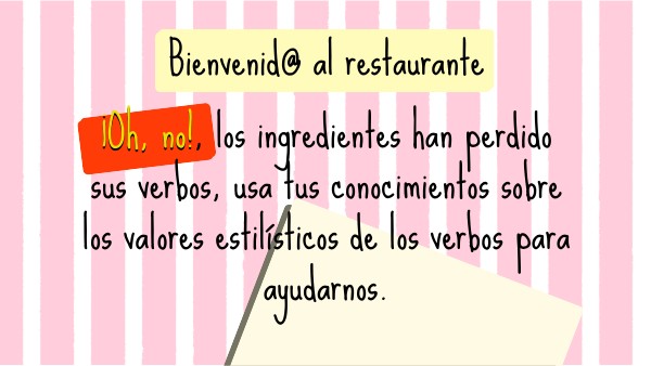 ¡Oh, no!, los ingredientes han perdido sus verbos, usa tus conocimientos sobre los valores estilísticos de los verbos para ayudarnos.