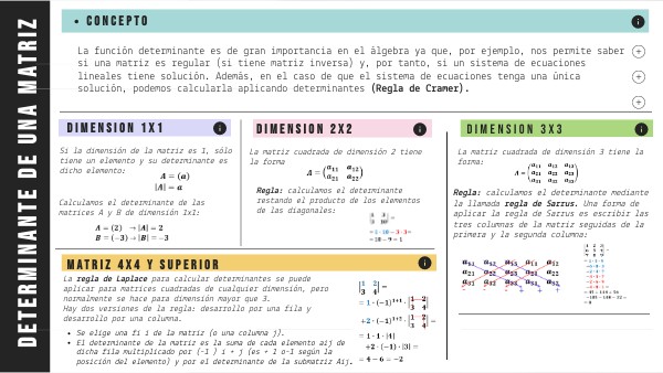 - El determinante de la matriz es la suma de cada elemento aij de dicha fila multiplicado por (−1 ) i + j (es + 1 o−1 según la posición del elemento) y por el determinante de la submatriz Aij.