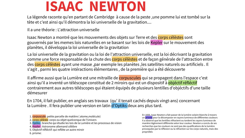 Il affirme aussi que la Lumière est une mitraille de corpuscules qui se propagent dans l'espace c'est ainsi qu'il a inventé un téléscope constitué de 2 miroirs qui est un dispositif à objéctif réfléctif contrairement aux autres téléscopes qui étaient équipés de plusieurs lentilles d'objéctifs d'une taille démesurer