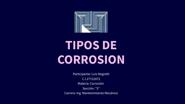Participante: Luis Negretti C.I.27722072 Materia: Corrosión Sección: “S” Carrera: Ing. Mantenimiento Mecánico