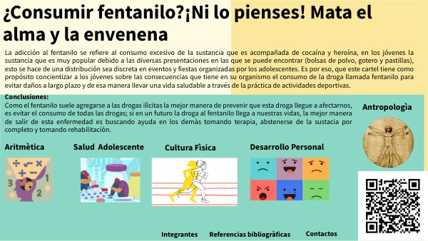 La adicción al fentanilo se refiere al consumo excesivo de la sustancia que es acompañada de cocaína y heroína, en los jóvenes la sustancia que es muy popular debido a las diversas presentaciones en las que se puede encontrar (bolsas de polvo, gotero y pastillas), esto se hace de una distribución sea discreta en eventos y fiestas organizadas por los adolescentes. Es por eso, que este cartel tiene como propósito concientizar a los jóvenes sobre las consecuencias que tiene en su organismo el consumo de la droga llamada fentanilo para evitar daños a largo plazo y de esa manera llevar una vida saludable a través de la práctica de actividades deportivas.