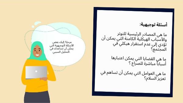 :أسئلة توجيهيةما هي المصادر الرئيسية للتوتر والأسباب الهيكلية الكامنة التي يمكن أن تؤدي إلى عدم استقرار هيكلي في المجتمع؟ما هي القضايا التي يمكن اعتبارها أسباباً مباشرة للصراع ؟ ما هي العوامل التي يمكن أن تساهم في تعزيز السلام؟