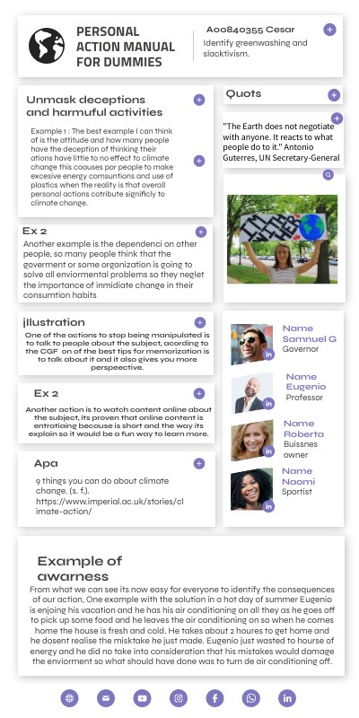 Example 1 : The best example I can think of is the attitude and how many people have the deception of thinking their ations have little to no effect to climate change this coauses por people to make excesive energy comsuntions and use of plastics when the reality is that overall personal actions cotribute significly to climate change.
