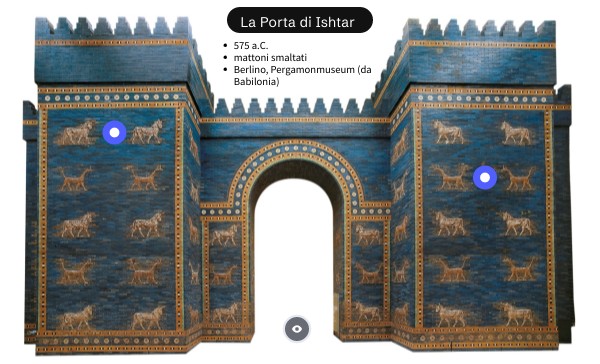 La porta dedicata a Ishtar, dea dell’amore e della guerra, fa parte delle mura che furono costruite per volere del re Nabucodonosor II attorno alla città di Babilonia nel 575 a.C. circa. Queste mura comprendevano diverse torri (distanti 18 metri l’una dall’altra) e 8 porte. Ogni porta era dedicata a una divinità diversa e quella di Ishtar era la più importante: da essa passava la strada principale della città, la via delle Processioni, che conduceva al tempio dedicato a Marduk, dio del tempo, sovrano di tutti gli dei.