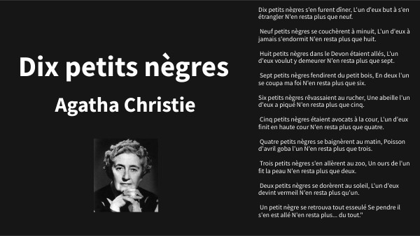 Dix petits nègres s'en furent dîner, L'un d'eux but à s'en étrangler N'en resta plus que neuf. Neuf petits nègres se couchèrent à minuit, L'un d'eux à jamais s'endormit N'en resta plus que huit. Huit petits nègres dans le Devon étaient allés, L'un d'eux voulut y demeurer N'en resta plus que sept. Sept petits nègres fendirent du petit bois, En deux l'un se coupa ma foi N'en resta plus que six. Six petits nègres rêvassaient au rucher, Une abeille l'un d'eux a piqué N'en resta plus que cinq. Cinq petits nègres étaient avocats à la cour, L'un d'eux finit en haute cour N'en resta plus que quatre. Quatre petits nègres se baignèrent au matin, Poisson d'avril goba l'un N'en resta plus que trois. Trois petits nègres s'en allèrent au zoo, Un ours de l'un fit la peau N'en resta plus que deux. Deux petits nègres se dorèrent au soleil, L'un d'eux devint vermeil N'en resta plus qu'un. Un petit nègre se retrouva tout esseulé Se pendre il s'en est allé N'en resta plus... du tout."