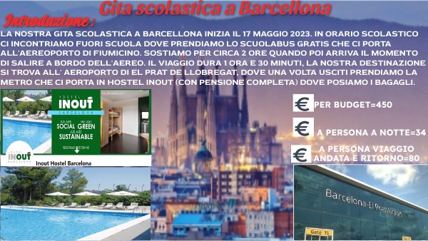 la nostra gita scolastica a Barcellona inizia il 17 maggio 2023. in orario scolastico ci incontriamo fuori scuola dove prendiamo lo scuolabus gratis che ci porta all'aereoporto di fiumicino. sostiamo per circa 2 ore quando poi arriva il momento di salire a bordo dell'aereo. il viaggio dura 1 ora e 30 minuti, la nostra destinazione si trova all' aeroporto di el prat de llobregat, dove una volta usciti prendiamo la metro che ci porta in hostel inout (con pensione completa) dove posiamo i bagagli.