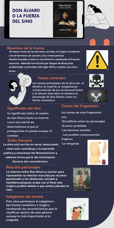 La relacion entre Don Álvaro y Leonor para representar la relación marcada por el amor apasionado y los obstáculos sociales y familiares,después acaba con el final más trágico posible debido a que ambos pierden la vida.
