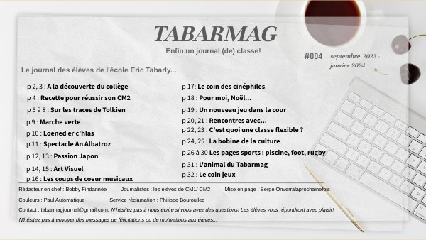 Rédacteur en chef : Bobby Findannée Journalistes : les élèves de CM1/ CM2 Mise en page : Serge Onverralaprochainefois Couleurs : Paul Automatique Service réclamation : Philippe Bouroullec Contact : tabarmagjournal@gmail.com. N'hésitez pas à nous écrire si vous avez des questions! Les élèves vous répondront avec plaisir! N'hésitez pas à envoyer des messages de félicitations ou de motivations aux élèves...