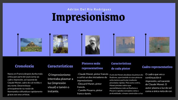 O cadro que ves a continuación é Impresión, sol nacente de Claude Monet. O autor plasma a luz do sol coma a única nota de cor.