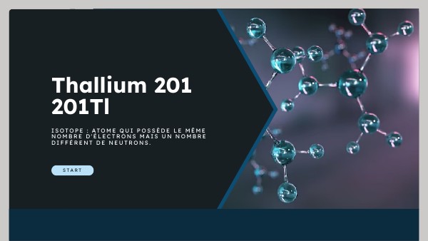 Un isotope du thallium dont le noyau est constitué de 81 protons et de 120 neutrons. Colonne dans le tableau périodique : 13 Issu d'une décroissance radioactive du plomb-201, en bombardant des cibles de thallium-203 par des protons :
