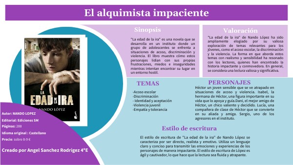 "La edad de la ira" de Nando López ha sido ampliamente elogiado por su valiosa exploración de temas relevantes para los jóvenes, como el acoso escolar, la discriminación y la violencia. La forma en que aborda estos temas con realismo y sensibilidad ha resonado con los lectores, quienes han encontrado la historia impactante y conmovedora. En general, se considera una lectura valiosa y significativa.