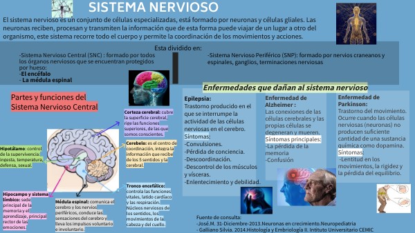 El sistema nervioso es un conjunto de células especializadas, está formado por neuronas y células gliales. Las neuronas reciben, procesan y transmiten la información que de esta forma puede viajar de un lugar a otro del organismo, este sistema recorre todo el cuerpo y permite la coordinación de los movimientos y acciones.