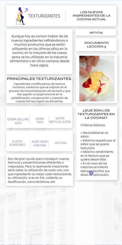 Son de gran ayuda para conseguir nuevas texturas y presentaciones diferentes o mejoradas. Pero lo realmente importante sería saber la utilización de cada uno, con que ingrediente va mejor cada texturizante, su utilización, si es en frío, caliente, su dosificación, características, etc