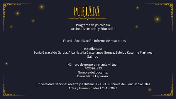 Programa de psicología Acción Psicosocial y Educación – Fase 5– Socialización Informe de resultados estudiantes: Sonia Baracaldo García, Alba Natalia Castellanos Gómez, Zuleidy Katerine Martínez Galindo Número de grupo en el aula virtual: 403026_293 Nombre del docente: Diana María Espinoza Universidad Nacional Abierta y a Distancia – UNAD Escuela de Ciencias Sociales Artes y Humanidades ECSAH 2023